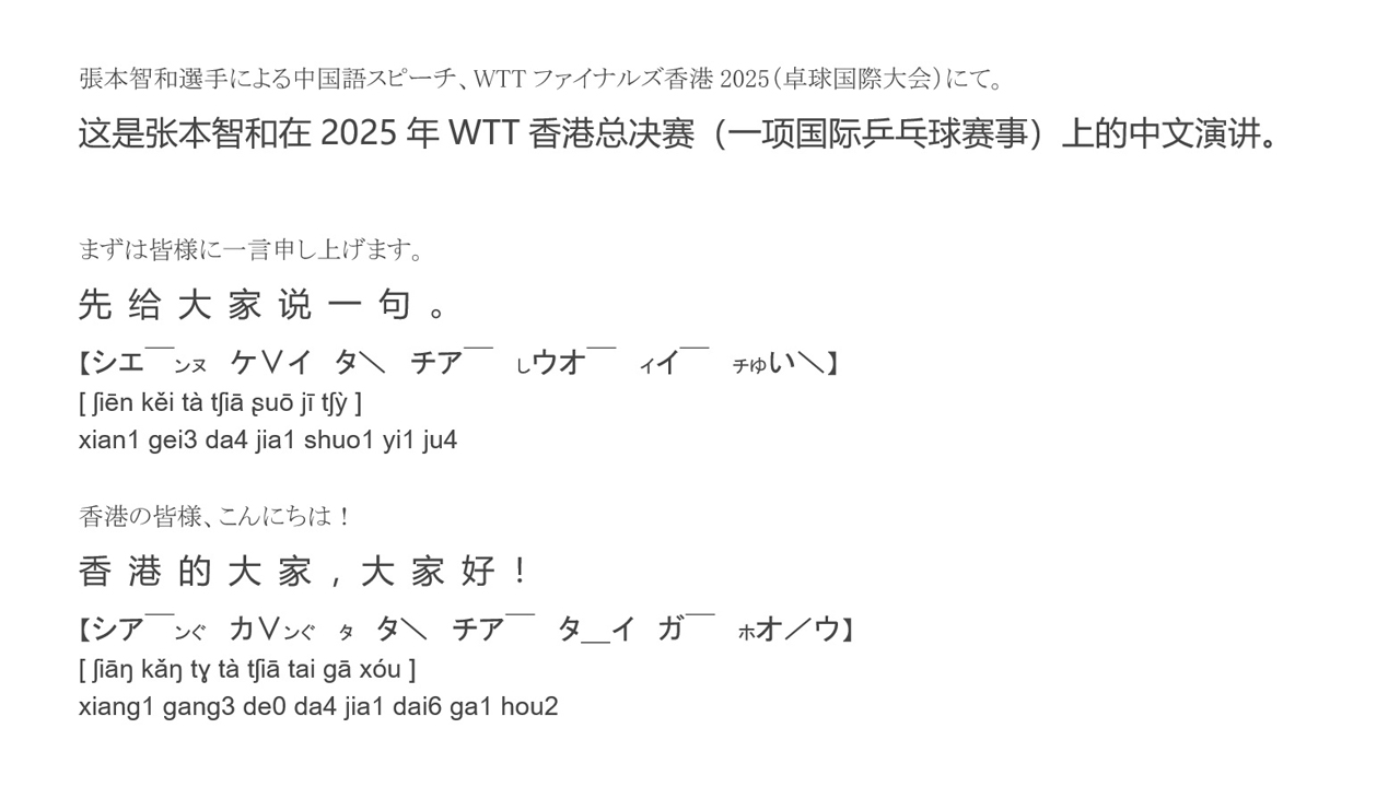 卓球の張本智和選手による中国語スピーチ。